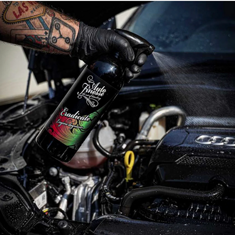 Auto Finesse Eradicate — это концентрированный очиститель двигателя и моторного отсека (Engine Cleaner & Degreaser). Он разработан для эффективного удаления жира, дорожной грязи, масляных отложений и засохших загрязнений из моторного отсека, а также для очистки поверхностей под капотом автомобиля, включая металл, пластик, резину и лакокрасочное покрытие. Продукт обладает выраженными обезжиривающими свойствами и легко справляется с трудными загрязнениями, не повреждая большинство материалов.